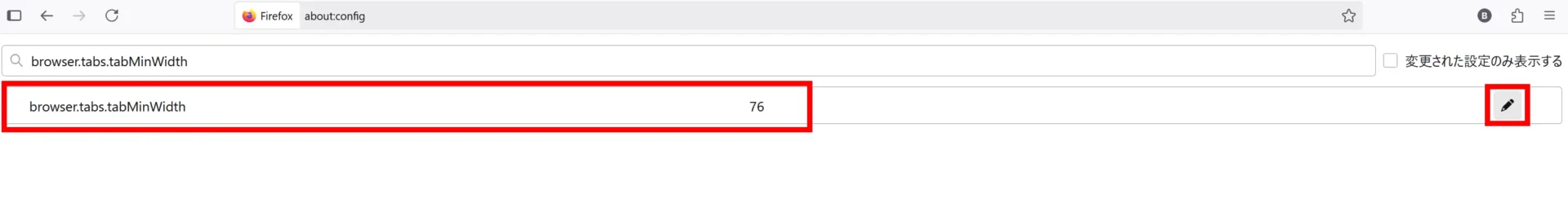 browser.tabs.tabMinWidth の項目が表示されます。初期状態では76になっていることがわかります。76はピクセル数を意味しており、タブがたくさん開かれている場合にタブが76px幅まで縮小され、それでも全てのタブを表示しきれない場合はスクロールする仕様ということです。