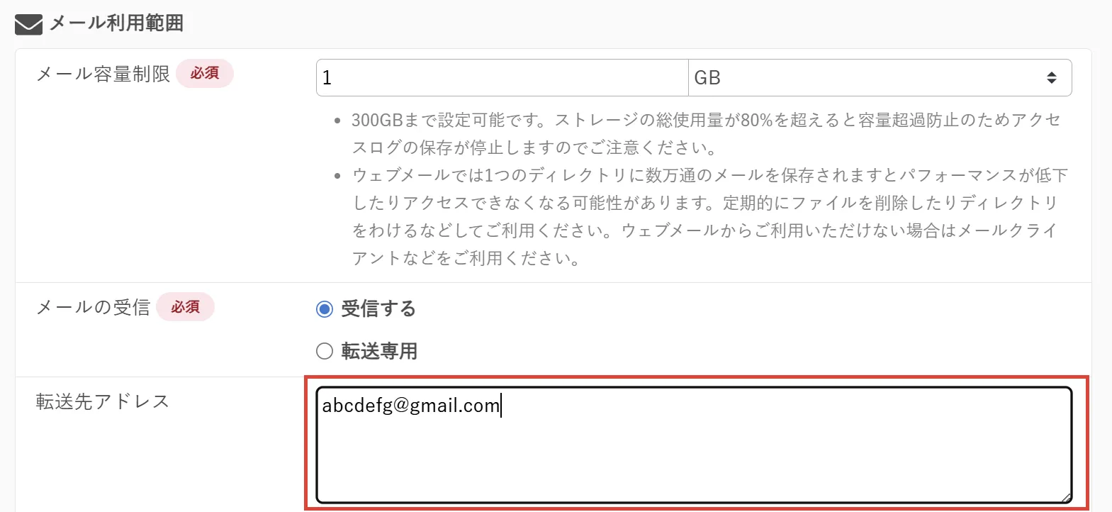 「メール利用範囲」の中に「転送先アドレス」の項目がありますので、転送したいメールアドレスを入力します。
