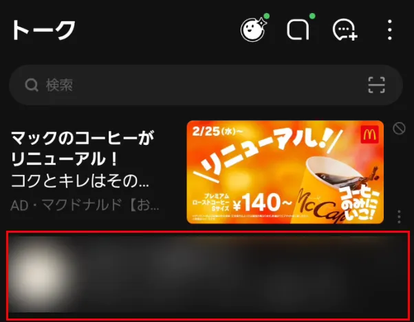 ブロックした状態で、トーク履歴を削除します。トーク画面から該当のアカウントを探します。下記画面の赤い枠内が公式アカウントだとします。ここはOSによって操作が違います。