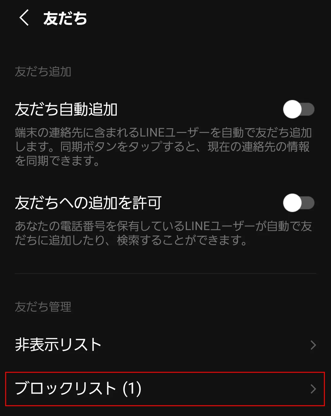 友だちの下の方にあるブロックリストをタップします。1件ブロックしている状態であることがわかりますね。