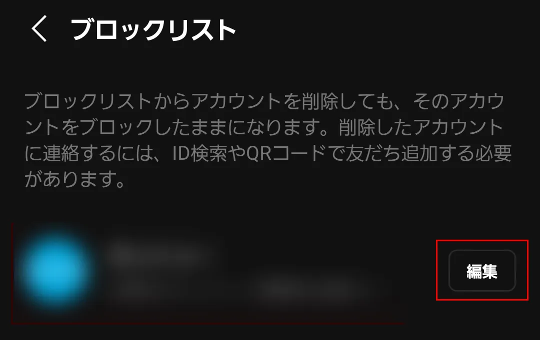 ブロックリストにさきほどブロックしたアカウントがあるはずです。編集をタップします。