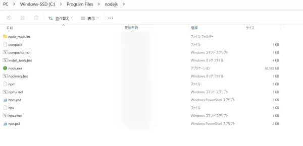 セキュリティエラーが発生して実行できませんでした。node.jsの格納先を確認すると npm.ps1 というファイルは確実に存在していることがわかります。