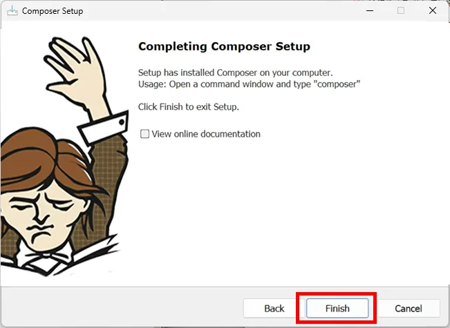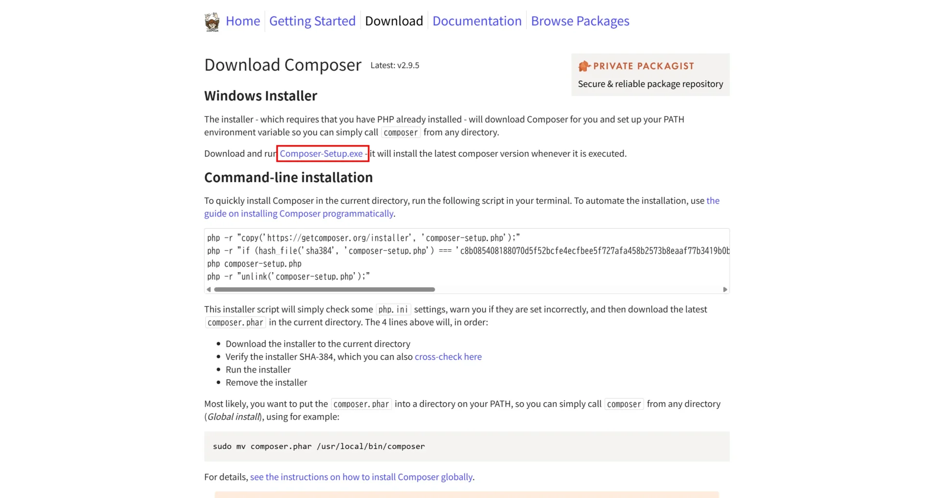 公式サイトからファイルをダウンロードします。一見わかりづらいのですが、冒頭のWindows InstalleのテキストリンクをクリックするとComposer-Setup.exeというEXEファイルがすぐに落ちてきます。