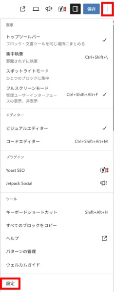 WordPressの投稿画面を開きます。右上の縦に三点が並んだメニューアイコンをクリックします。メニューが開きますので「設定」をクリックします。