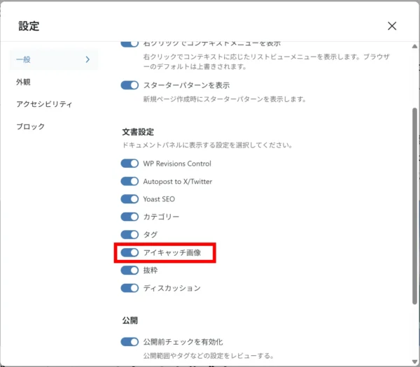 アイキャッチ画像の項目がオンになっているか確認します。暗転した状態がオフです。オン=青アイコンの状態に変更します。変更が完了しましたらメニューを閉じます。